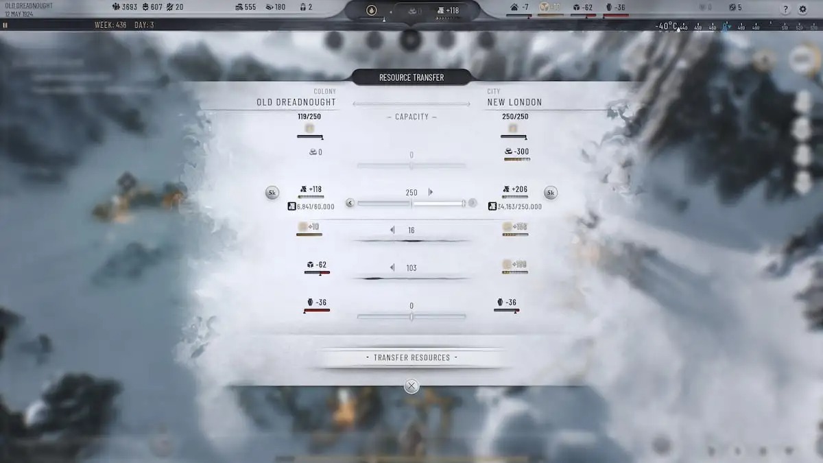 Когда в «Старом дредноуте» будет достаточно нефти, нажмите на значок колонии в правом верхнем углу и выберите «Передача ресурсов». Переместите ползунок нефти в сторону Нью-Лондона, пока не будет передано как минимум 75 единиц нефти. Подтвердите передачу для завершения задания.