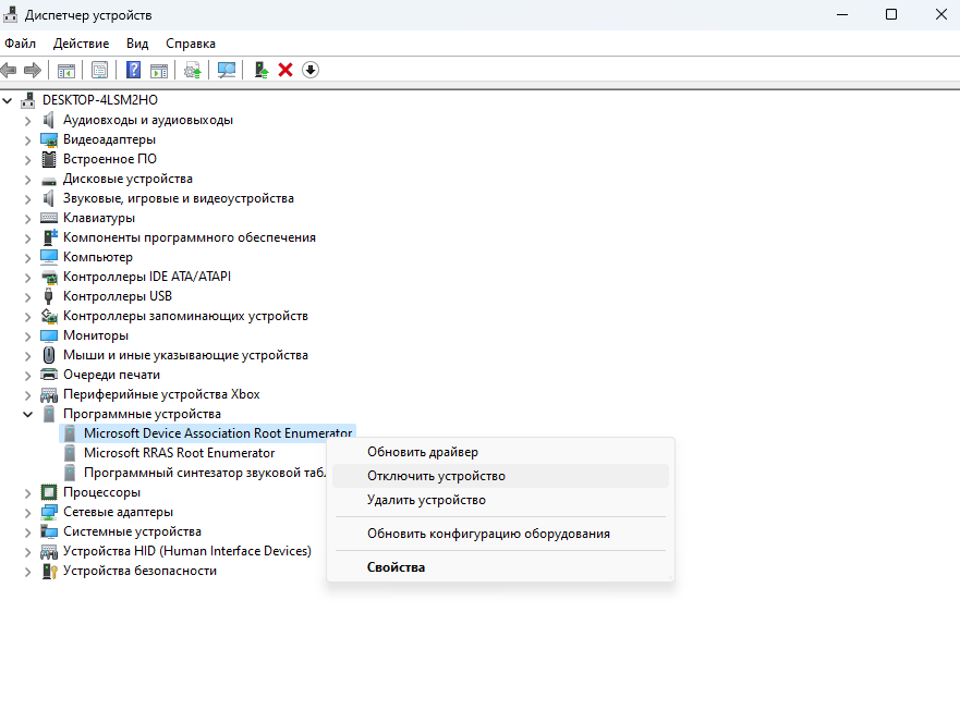 Запустите Диспетчер устройств, найдите Программные устройства. Microsoft Device Association Root Enumerator и отключите его.