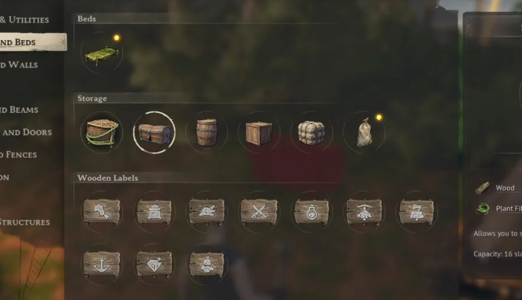 Сундуки строятся через панель строительства (клавиша B) во вкладке «Хранилище и кровати». Им не нужна крыша для работы, но лучше располагать их рядом с верстаком для удобного крафта.