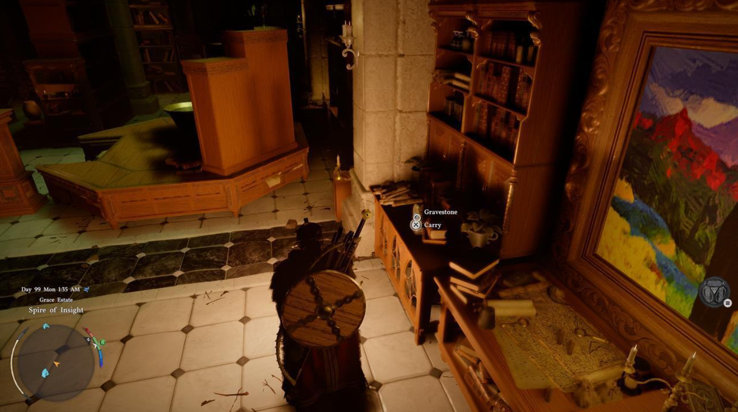 Решение: Найдите надгробную плиту на комоде и поместите её в чашу. После этого нажмите переключатель, чтобы активировать подъемник.