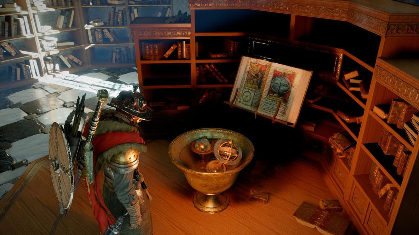 Оказавшись на первом этаже, вы сможете забрать чертеж «Дистанционное оружие мира: Луки, том 2». Затем прочтите книгу со второй загадкой: «Даже спустя много лет оставленные следы возрождают забытые сказания».