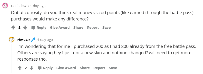 В конце поста пользователь отмечает, что спустя 5 дней его показатели вернулись к тому, что было до покупки баттл-пасса, и он уже не уверен в своих выводах. В комментариях пользователи делятся своими историями, которые вносят только больше неразберихи. Некоторые отмечают, что если играть не каждый день, то K/D будет постепенно увеличиваться. По их словам, самый лучший результат будет, если играть раз в 3-4 дня.