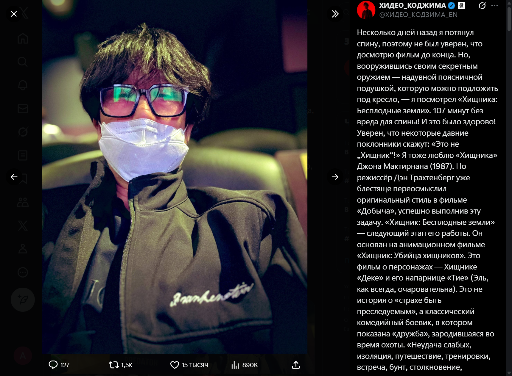В своем аккаунте в X геймдизайнер, сценарист и режиссер Death Stranding поделился впечатлениями от двух недавних премьер — научно-фантастического сериала Винса Гиллигана «Из многих» (он же Pluribus) и фильма Дэна Трахтенберга «Хищник: Планета смерти» (он же Predator: Badlands).