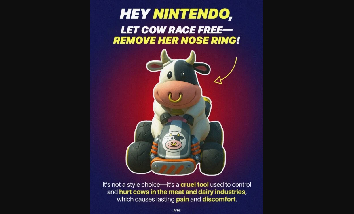 Организация по защите прав животных (PETA) направила письмо президенту Nintendo Сюнтаро Фурукаве с просьбой изменить дизайн персонажа Коровы в Mario Kart World. Причиной стало латунное кольцо в носу.