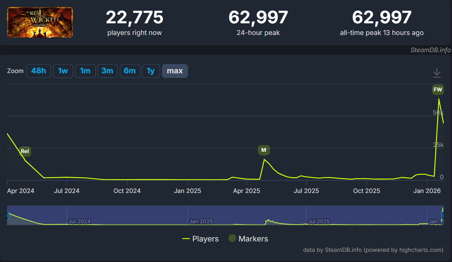 Изометрический экшен No Rest for the Wicked переживает крупнейший всплеск активности с момента своего выхода. Благодаря релизу масштабного обновления Together, которое добавило в игру долгожданный кооперативный режим, пиковый онлайн в Steam взлетел до 62 997 человек. Это почти в два раза больше предыдущего рекорда в 36 тысяч, установленного на старте раннего доступа в апреле 2024 года.