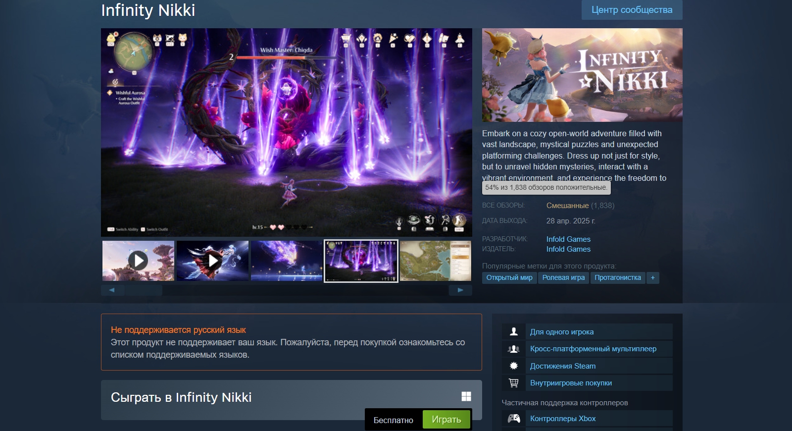 Игроки преимущественно порадовались появлению гачи Wuthering Waves в Steam, однако прибытие Infinity Nikki в магазин Valve прошло заметно жестче. Геймеры крайне неоднозначно встретили «годную мужскую игру» с волшебными платьями, отругав ее за некоторые технические проблемы Steam-версии и ряд уже закоренелых ошибок. На момент написания новости рейтинг Infinity Nikki составил 54% при свыше 1,8 тысячи отзывов: