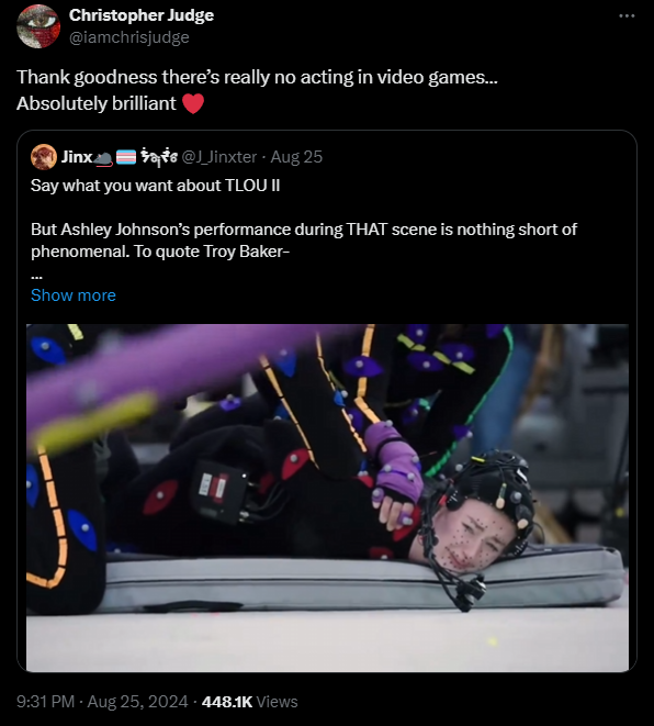 Джадж кратко и резко ответил на эти слова, комментируя впечатляющую сцену захвата движения из The Last of Us 2 с участием Эшли Джонсон, саркастически отметив, что «как же здорово, что в видеоиграх действительно нет актерской игры». Это был явный ответ на заявления Хартмана.
