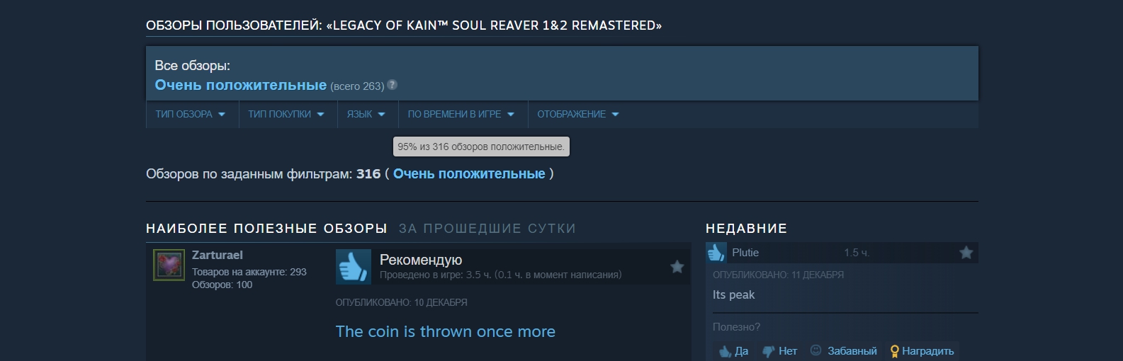 10 декабря состоялся релиз ремастера Legacy of Kain: Soul Reaver 1 & 2. Переиздание двух культовых головоломок про карабканье по стенам и планирование со сломанными крыльями не разочаровало игроков: его рейтинг в Steam составил 95% при нескольких сотнях отзывов.