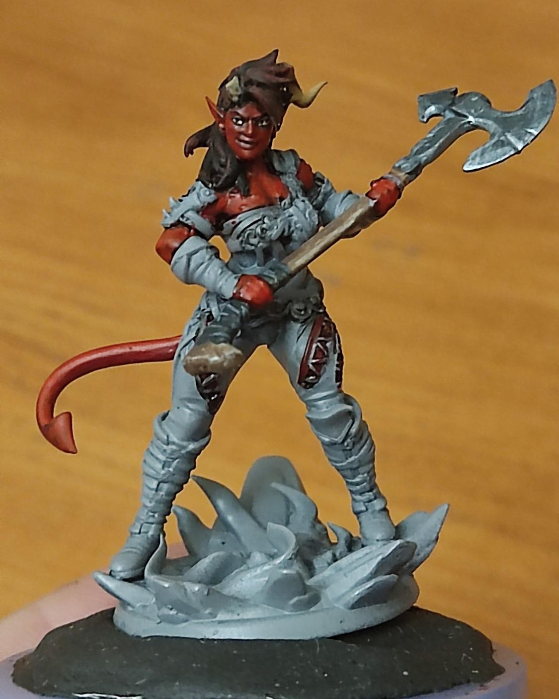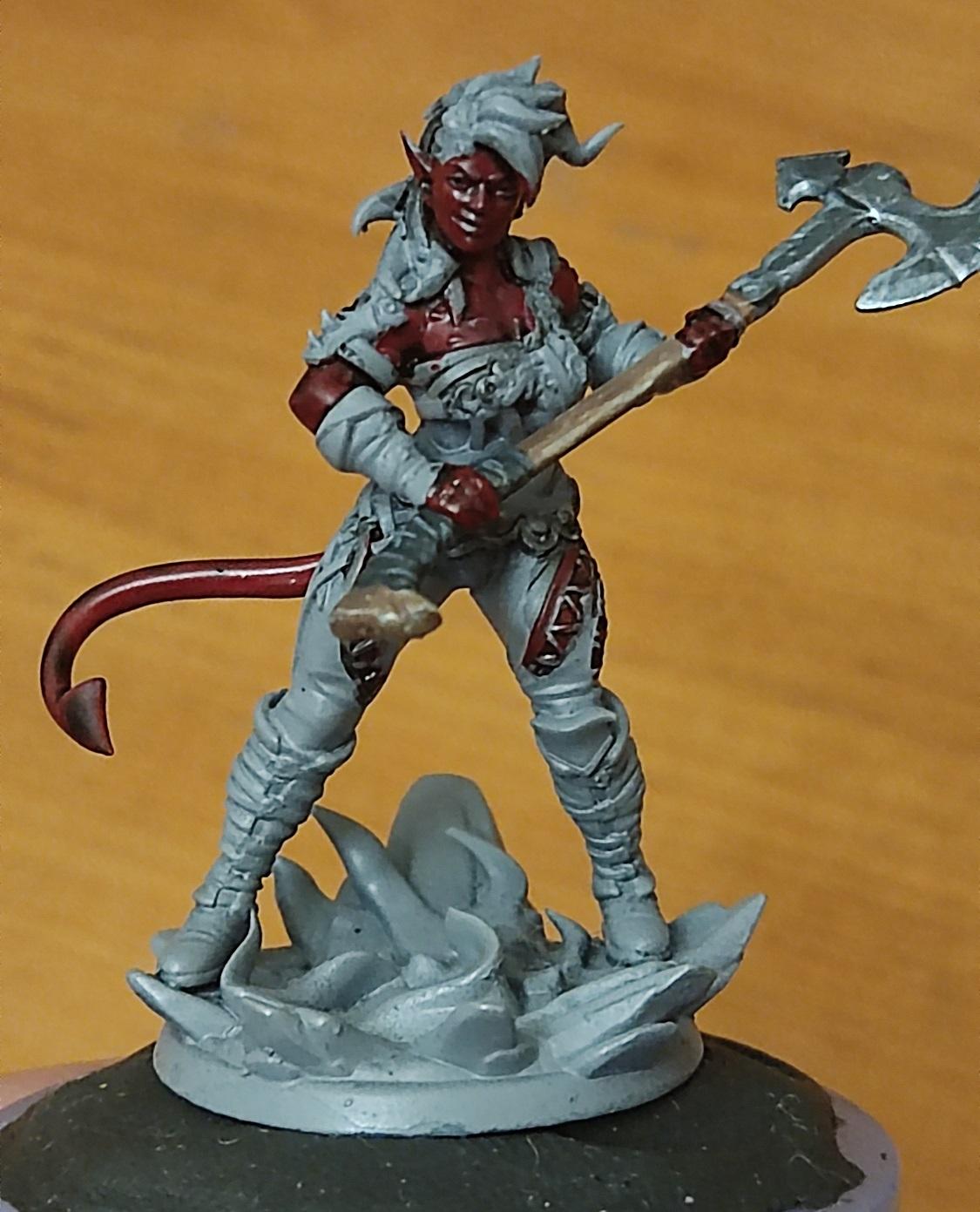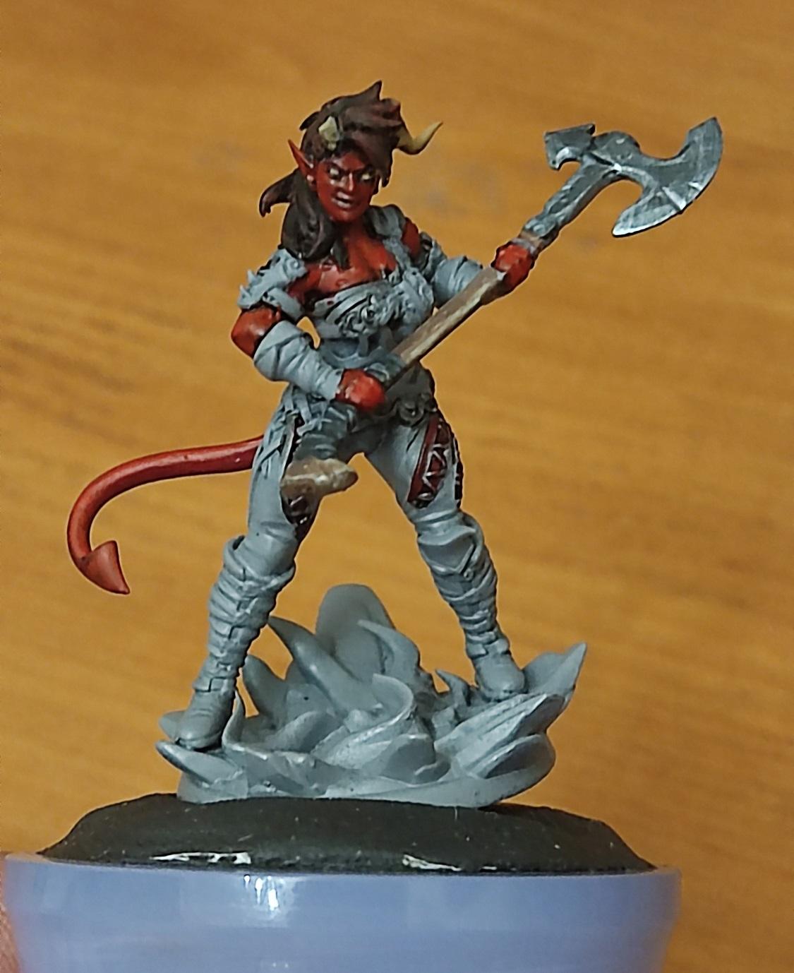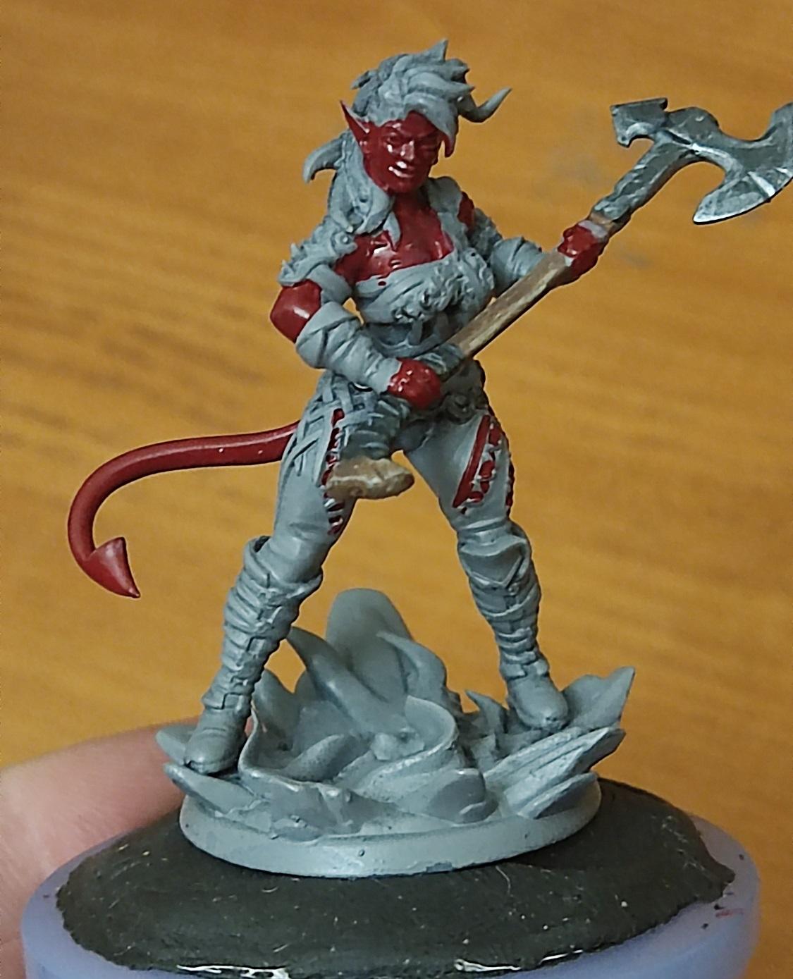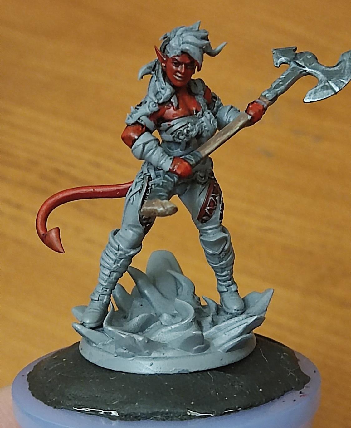 Ну, топор вроде удался. Начинаем красить кожу. Чарла у нас постоянно на стрессе, поэтому краснокожая — капаем на нашу палитру красного (я люблю потемнее), разбавляем краску до кондиции и начинаем убивать Баттерса красить нашего тифлинга.