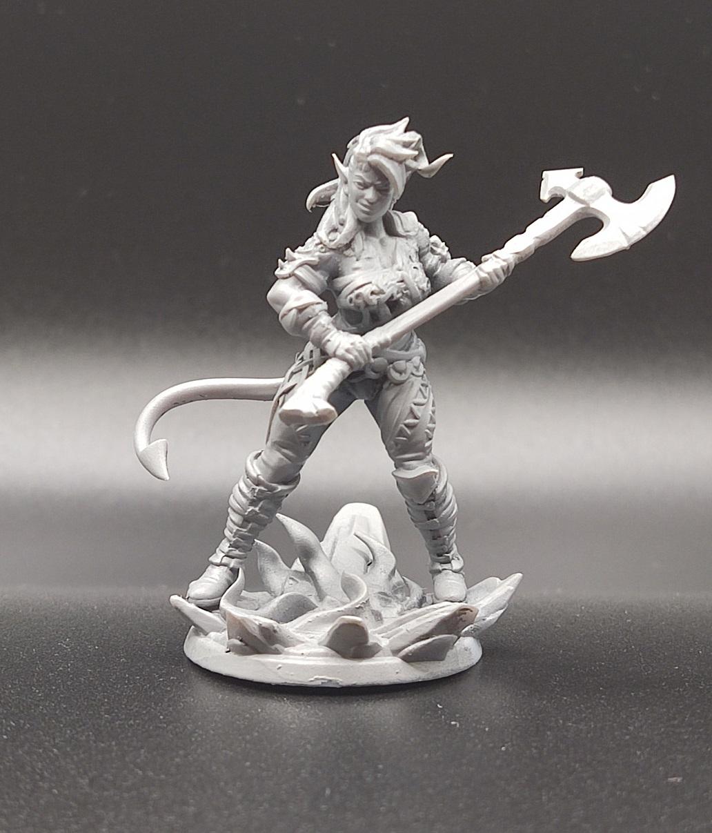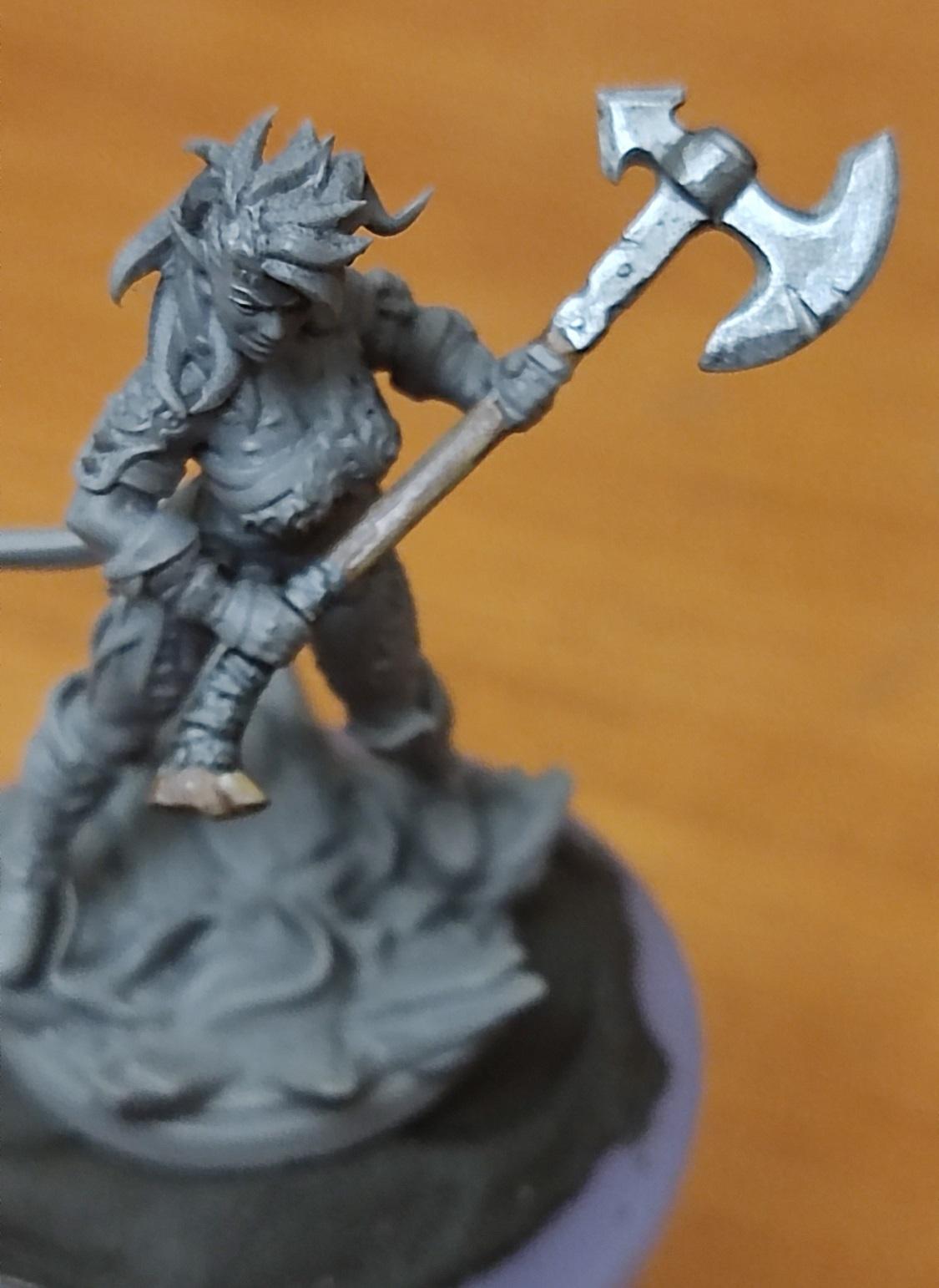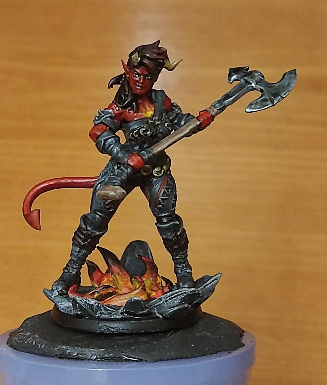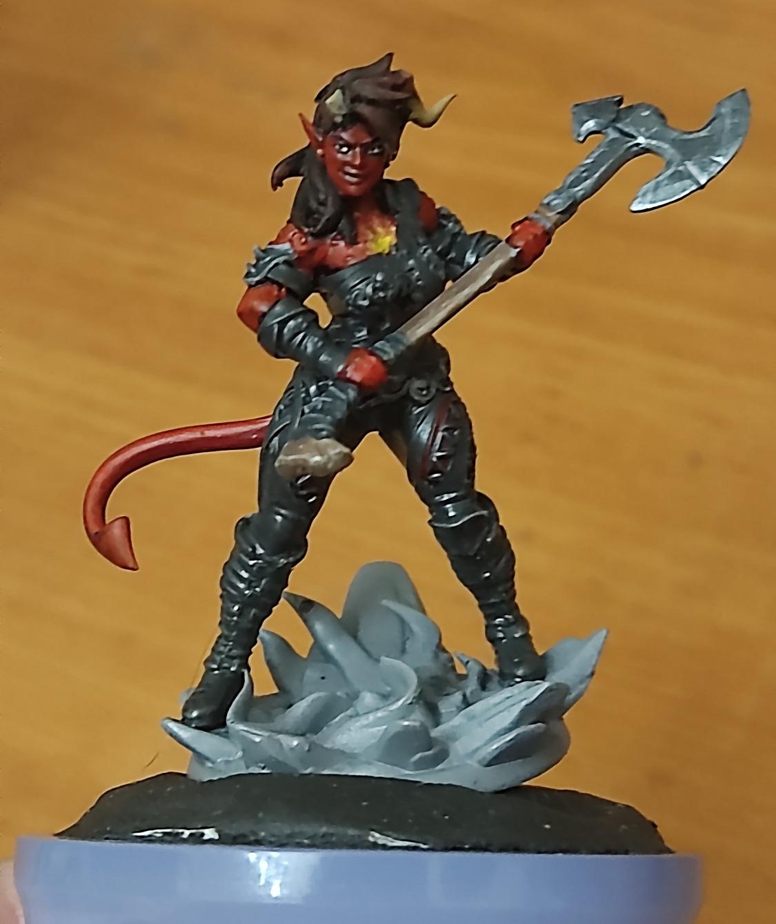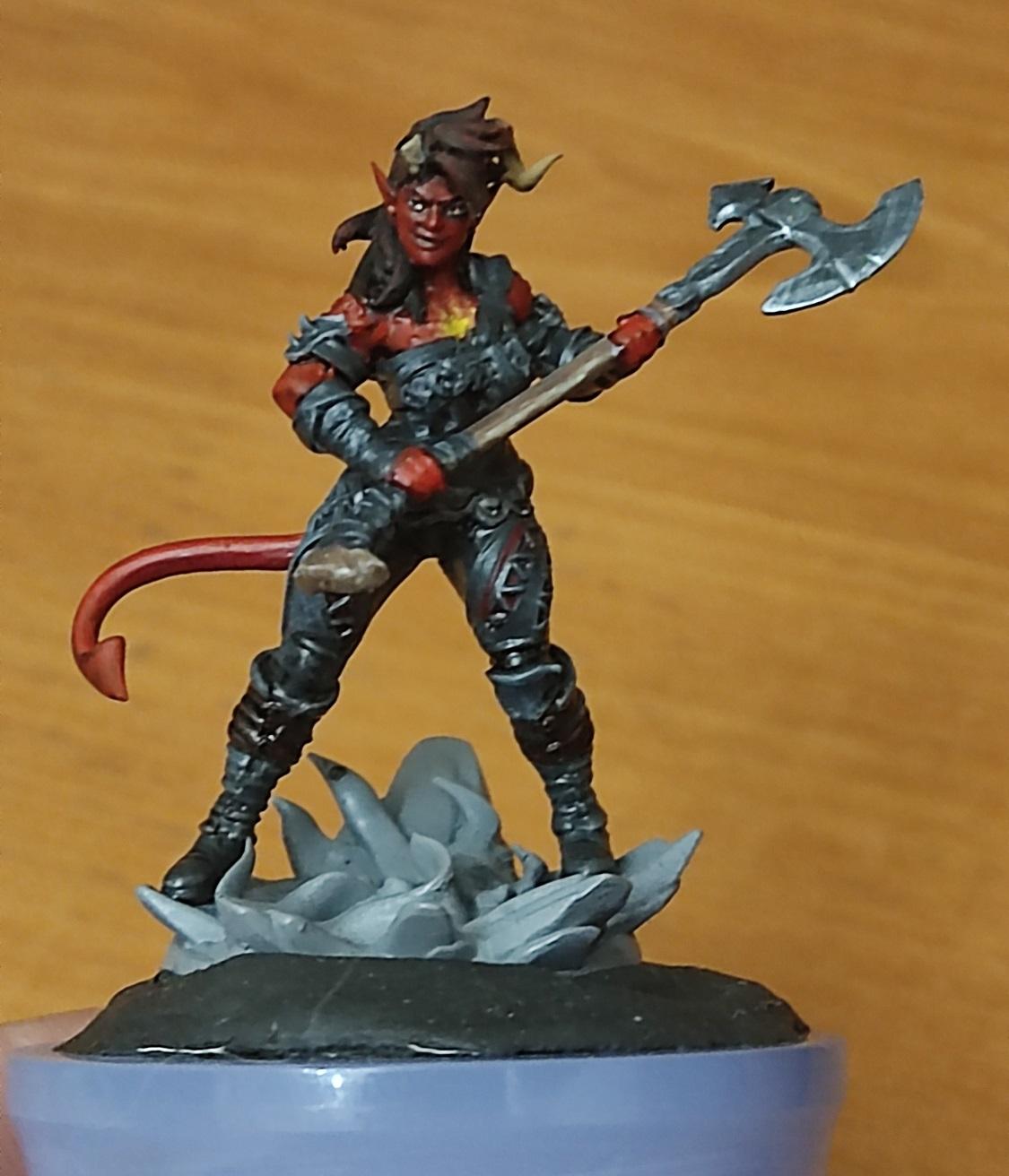 Ну, топор вроде удался. Начинаем красить кожу. Чарла у нас постоянно на стрессе, поэтому краснокожая — капаем на нашу палитру красного (я люблю потемнее), разбавляем краску до кондиции и начинаем убивать Баттерса красить нашего тифлинга.