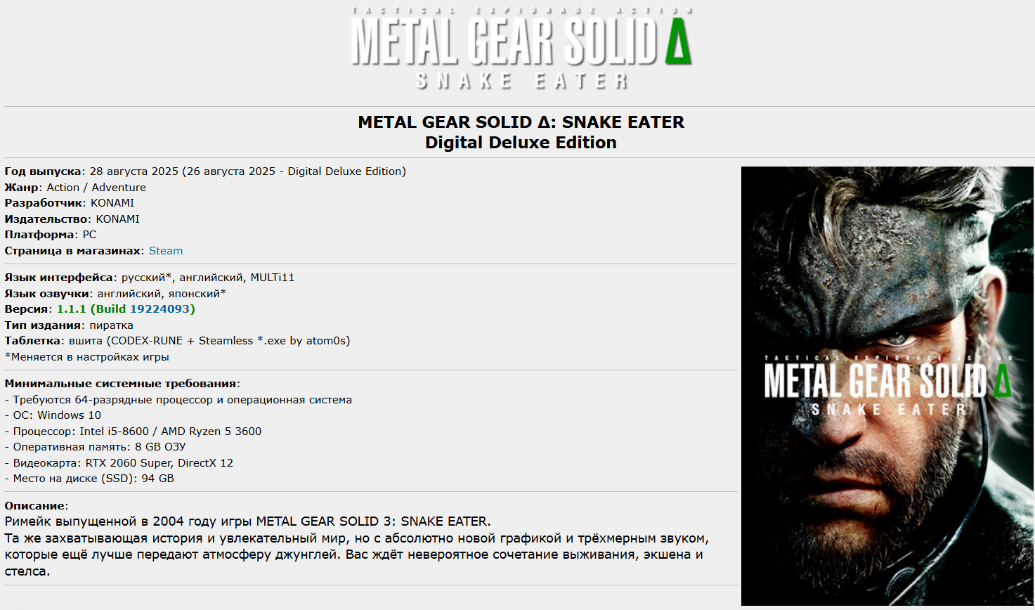 За два дня до полноценного релиза в Steam в «зеленых магазинах» появилась Metal Gear Solid Delta: Snake Eater. Ремейк культовой игры Кодзимы можно скачать скачать с торрентов благодаря выходу Deluxe-издания, что дает доступ на два дня раньше полноценного релиза. И отсутствие Denuvo, конечно, тоже нужно поблагодарить. Возможно, разработчики и хотели бы вставить защиту в свою игру, но, как говорят эксперты, с производительностью все настолько плохо, что Denuvo, наверное, превратила бы игровой процесс в слайд-шоу.