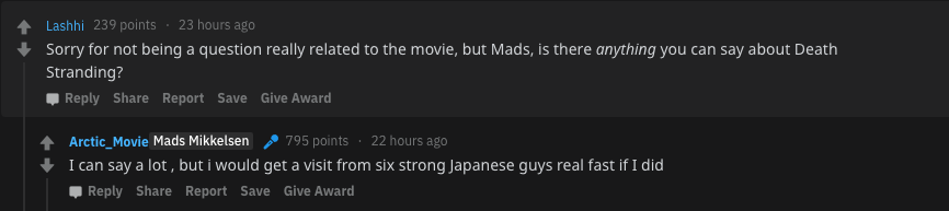Мадс Миккельсен провел сессию AMA (Ask Me Anything — спроси меня что угодно) на Reddit и столкнулся с многочисленными вопросами о Death Stranding, на которые дал забавный ответ.