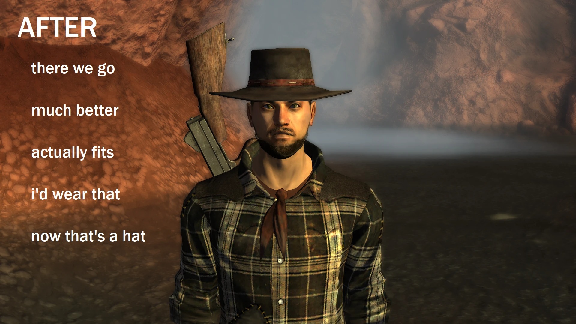 В Fallout New Vegas есть персонаж Дэниэл из дополнения Honest Hearts, который является мормоном и носит необычную шапку. Говорят, в среде поклонников игры он не очень популярен, потому что... потому что многие считают его скучным «душнилой». Возможно, поэтому, как пишет rEdQUINOX, моддер с просторов Nexus Mods, никто раньше не пытался исправить шапку героя. Ведь она, очевидно, слишком велика для его головы.
