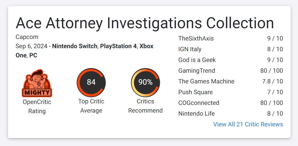 ComingSoon.net: 9,5/10. «Ace Attorney Investigations Collection — это одно из лучших переизданий от Capcom на сегодня».