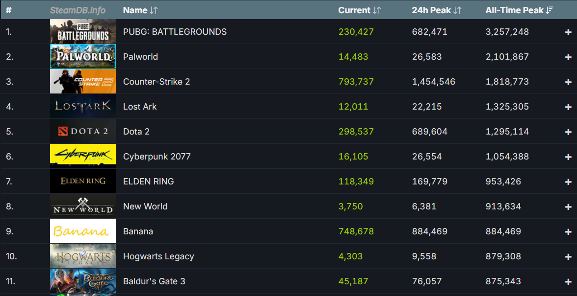 Мы живем в проклятом мире, который сами создали. Кликер Banana, наводненный ботами, что признают сами разработчики, взобрался на девятую строчку топ-10 игр Steam по пиковому онлайну. С результатом в 884 469 человек игра, если ее можно так назвать, вытеснила из списка лучших Baldur’s Gate 3. Масштабная, глубокая, интересная, продуманная, сделанная сотнями людей, трудившимися несколько лет, ролевая игра теперь на 11-м месте.