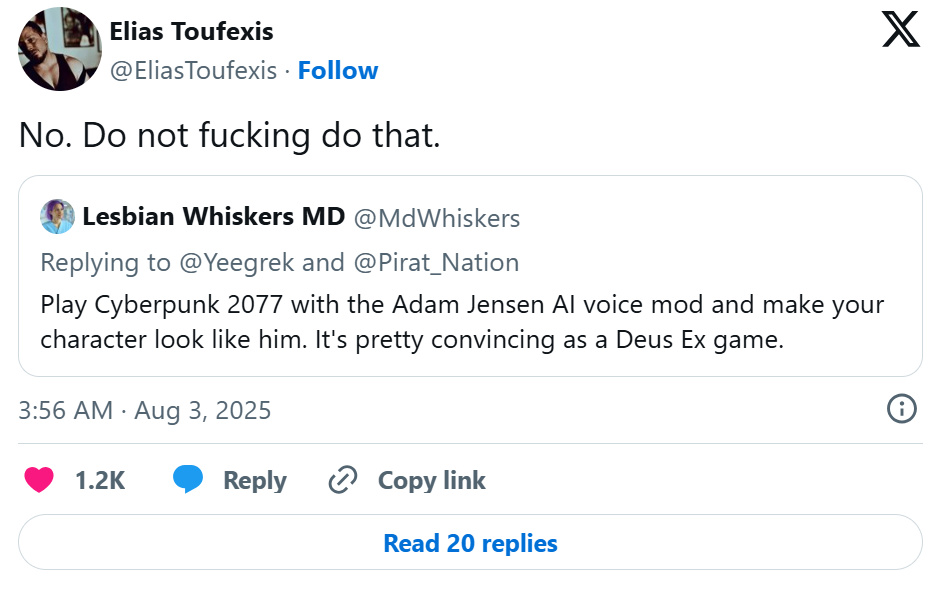 Актер Элиас Туфексис, озвучивший Адама Дженсена в серии Deus Ex, резко отреагировал на модификацию для Cyberpunk 2077, в которой используется ИИ-озвучка его персонажа. В ответ на предложение заменить голос главного героя Ви на голос Дженсена, созданный с помощью нейросети, он написал: «Нет. Не делай этого, [блин]».
