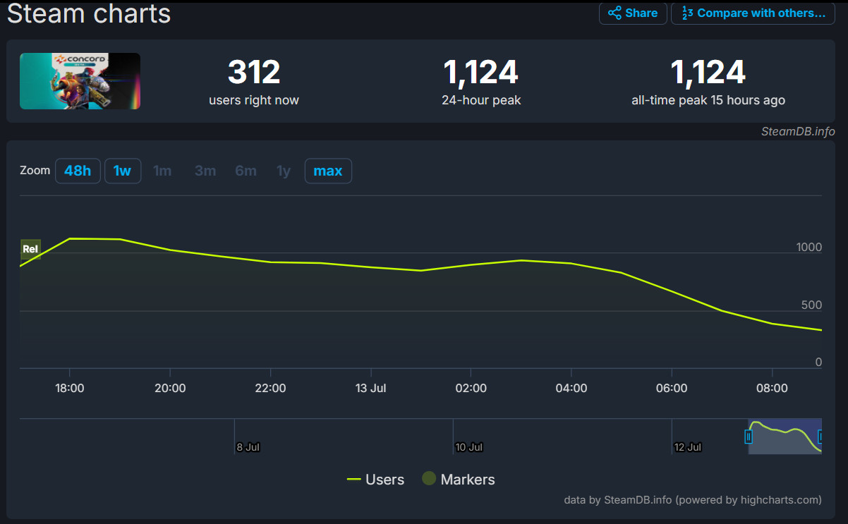 Об этом говорит пиковый онлайн в 1124 человека. В момент написания новости же в Concord одновременно находится 312 человек, причем со временем онлайн падает все ниже, не возвращаясь к прежним значениям.
