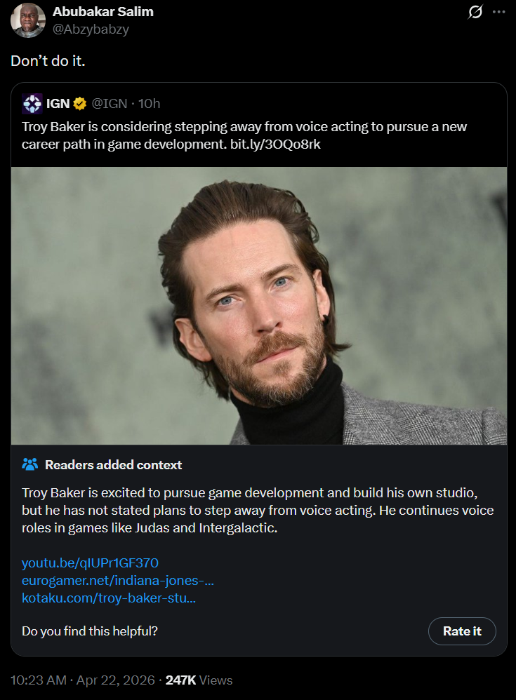 Звезда The Last of Us и недавно вышедшей Mouse P.I. For Hire Трой Бейкер во всеуслышание заявил о желании основать собственную студию, чтобы рассказывать «свои собственные истории». Однако его коллега Абубакар Салим, который уже прошел этот путь, основав Surgent Studios, в ответ на такие планы лаконичен: «Не делай этого».