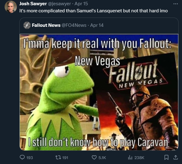 Разработчик Джош Сойер, один из главных создателей Fallout New Vegas, выразил несогласие с мнением, что карточная игра «Караван» от Obsidian является сложной. Он прокомментировал мем в соцсети X, в котором неизвестный признается, что «до сих пор не знает, как в это играть».