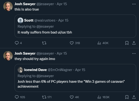 Джош Сойер не согласен с нытиками. Он говорит, что игра не такая сложная. Один геймер указал, что в Steam лишь 6% игроков получили достижение, которое выдается за три победы в «Караване». Сойер предложил «попробовать еще разок». Однако разработчик согласился, что «Караван» можно винить за не очень понятный пользовательский интерфейс.
