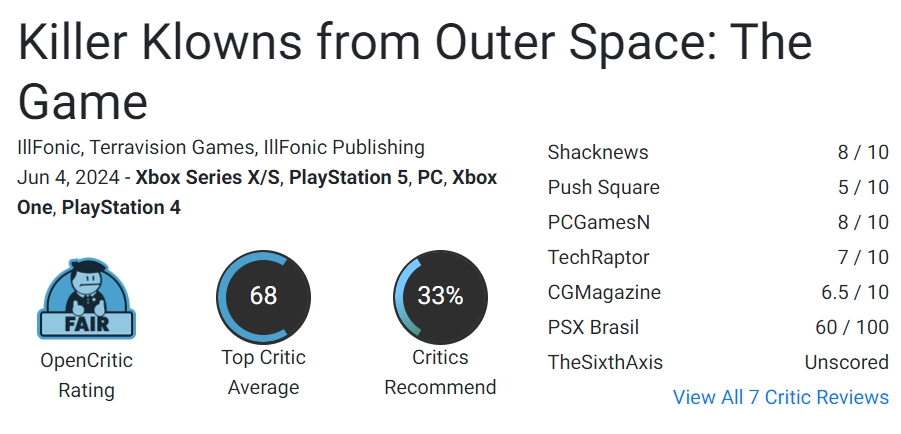 Пресса опубликовала первые оценки Killer Klowns from Outer Space: The Game, асимметричного хоррора по мотивам старенького ужастика про голодных клоунов-убийц из далекого космоса. Журналисты смешано встретили грядущую новинку, в среднем оценив ее на 6,8 балла из 10. Из минусов критики выделяют проблемы с балансом и разнообразием персонажей, на которые можно закрыть глаза только если вы заядлый фанат первоисточника: