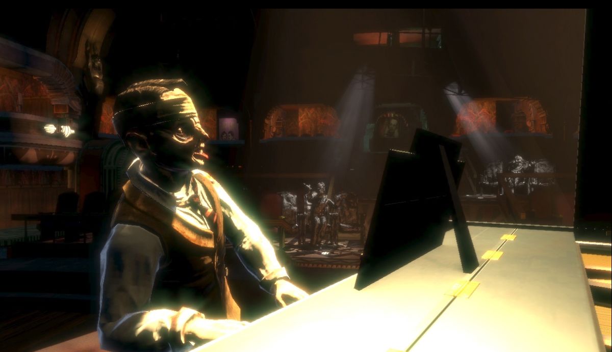 Д. Т. прошел еще часть уровня, и тут экран задрожал, а за кадром зазвучал металлический звук тяжелых шагов. Мы услышали печальный вопль — что-то среднее между стоном кита и чудовища Франкенштейна. Большой Папочка был рядом. Заглянув за угол, мы увидели его: неповоротливого громилу, запертого в старом водолазном скафандре. Он ковылял вслед за Маленькой Сестричкой, которая приближалась к аппетитного вида трупу, валявшемуся в коридоре.