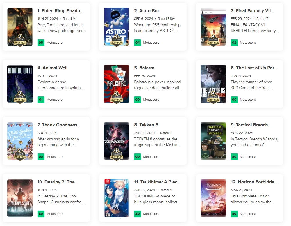 Astro Bot уступает DLC для Elden Ring, Shadow of the Erdtree, у которого 95 баллов от СМИ. Однако это дополнение, поэтому лучшей самостоятельной игрой считается новинка Sony. За Astro Bot следуют такие эксклюзивы для PS5, как Final Fantasy 7 Rebirth с 92, Animal Well с 91 и Balatro с 90.