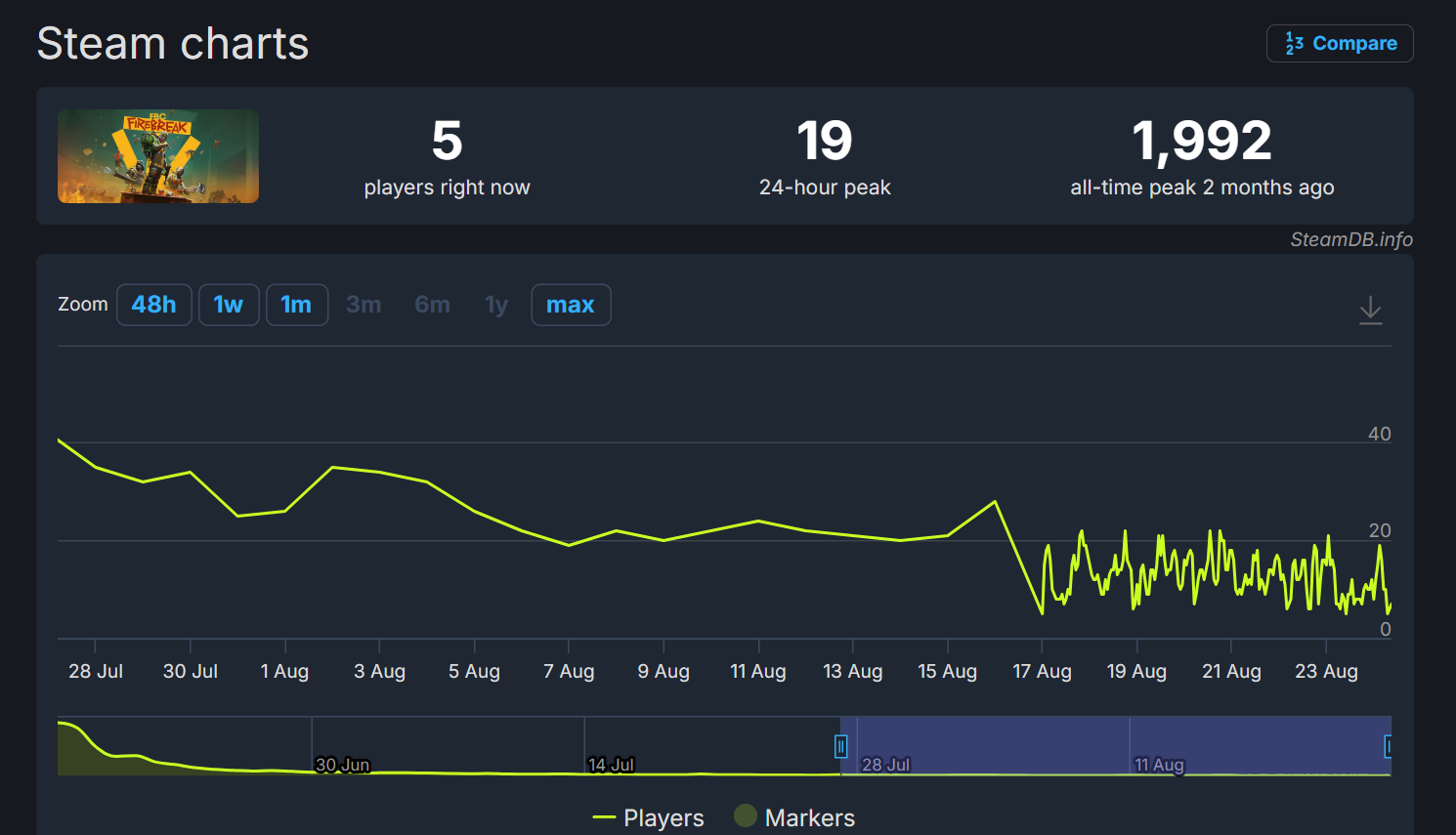 В игре наблюдается продолжение спада, который начался еще в июле. Спустя месяц после выхода, пиковый онлайн в Steam уже скатился до двузначных значений. Для сравнения: в день релиза игра достигла почти 2 тысячи одновременных игроков на этой платформе.