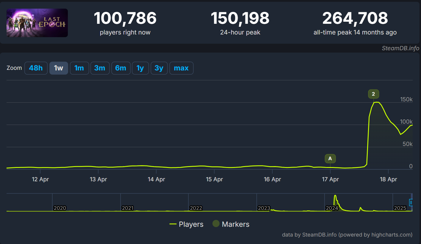Патч Tombs of the Erased вышел 17 апреля и сразу же подкинул Last Epoch в топ Steam — с нескольких тысяч игроков онлайн до внушительных 150 тысяч, по данным SteamDB. Сейчас игра входит в десятку самых популярных тайтлов на платформе, обгоняя даже Baldur’s Gate 3.