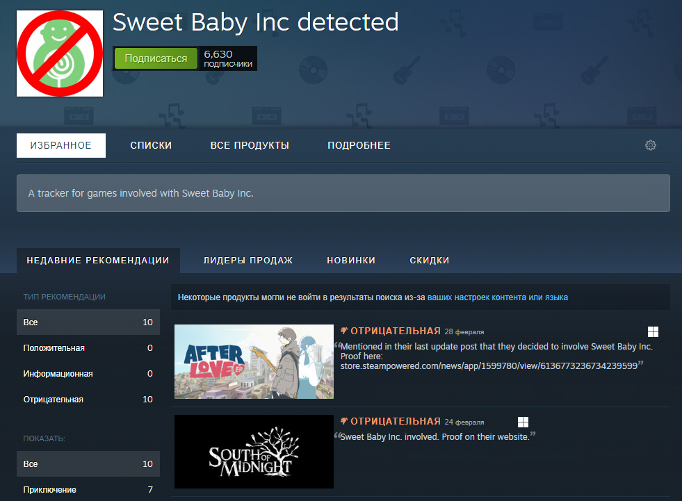 Куратор в Steam так и называется: Sweet Baby Inc. Он уже отметил десять игр, большая часть из которых выглядят идеальной рекомендацией для блокировки со стороны Роскомнадзора. Каждую игру куратор комментирует: «Sweet Baby Inc замешана. Доказательства на их сайте».