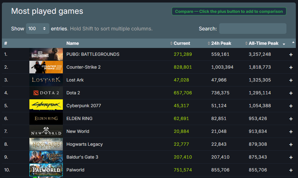 Первый неожиданный хит 2024 года, «выживач» Palworld, в котором нужно ловить милых существ и продавать их в рабство, или разводить, скармливая детенышей сородичам, неожиданно ворвался в топ-10 игр Steam с максимальным онлайном. Пока что новинка расположилась на 10 строчке, уступая Baldur's Gate 3 и Hogwarts Legacy. Данные портала SteamDB.