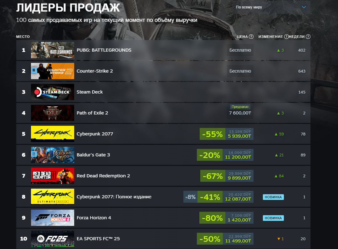 Valve поделилась свежим чартом мировых продаж в Steam. Лидерами по выручке стали условно-бесплатные PUBG и Counter-Strike 2, следом за которыми идет портативный ПК Steam Deck. А вот на четвертой строчке расположился неожиданный гость — Path of Exile 2.