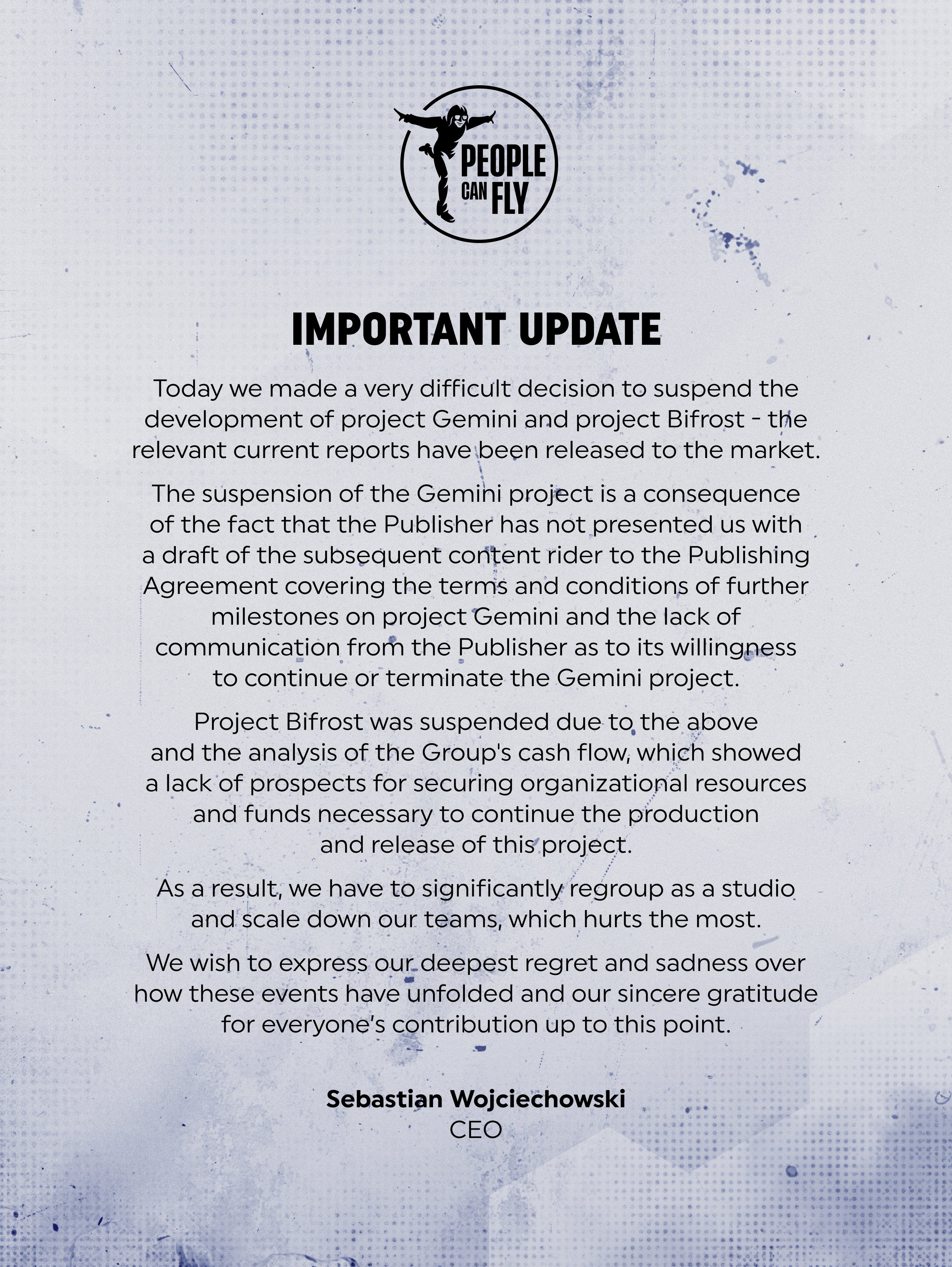 В конце 2024 года People Can Fly уже сократила команду проекта Bifrost, однако теперь разработку предстоящей VR-игры и вовсе заморозили из-за нецелесообразных расходов. В придачу к ней студия приостановила создание проекта Gemini, издаваемого Square Enix. Как объясняет глава компании Себастьян Войцеховский: заморозка Gemini связана с тем, что японская команда не согласовала дальнейшее сотрудничество. «В результате People Can Fly, как студии, придется значительно перестроить и сократить команду».
