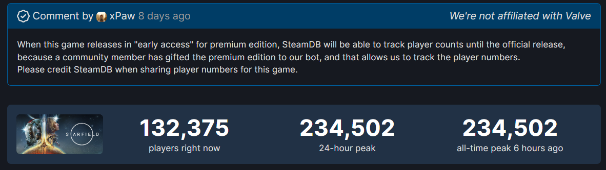 Портал SteamDB получил возможность изучать онлайн Starfield по числу игроков, купивших премиальное издание. Оно дает ранний доступ к новинке Bethesda. Таковых геймеров в первый день оказалось свыше 230 тысяч человек. Что, наверное, довольно неплохо для игры, доступной как на торрентах, так и по подписке Game Pass, в том числе на ПК.