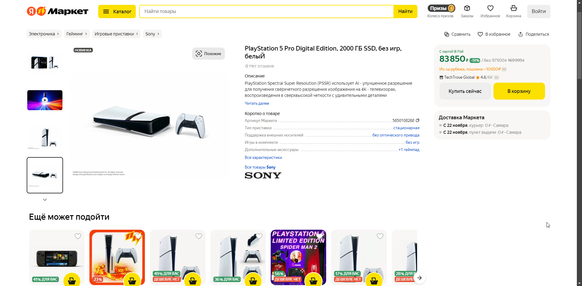PlayStation 5 Pro появилась на Маркете от Яндекса. Консоль стоит значительно дешевле, чем в «М.Видео-Эльдорадо», которая оформляла предзаказы за 130 тысяч рублей, правда, обещая вернуть 30 000 в качестве кэшбека. На момент написания заметки приставку можно было ухватить за 83 850 рублей. Правда, без нюансов не обошлось.