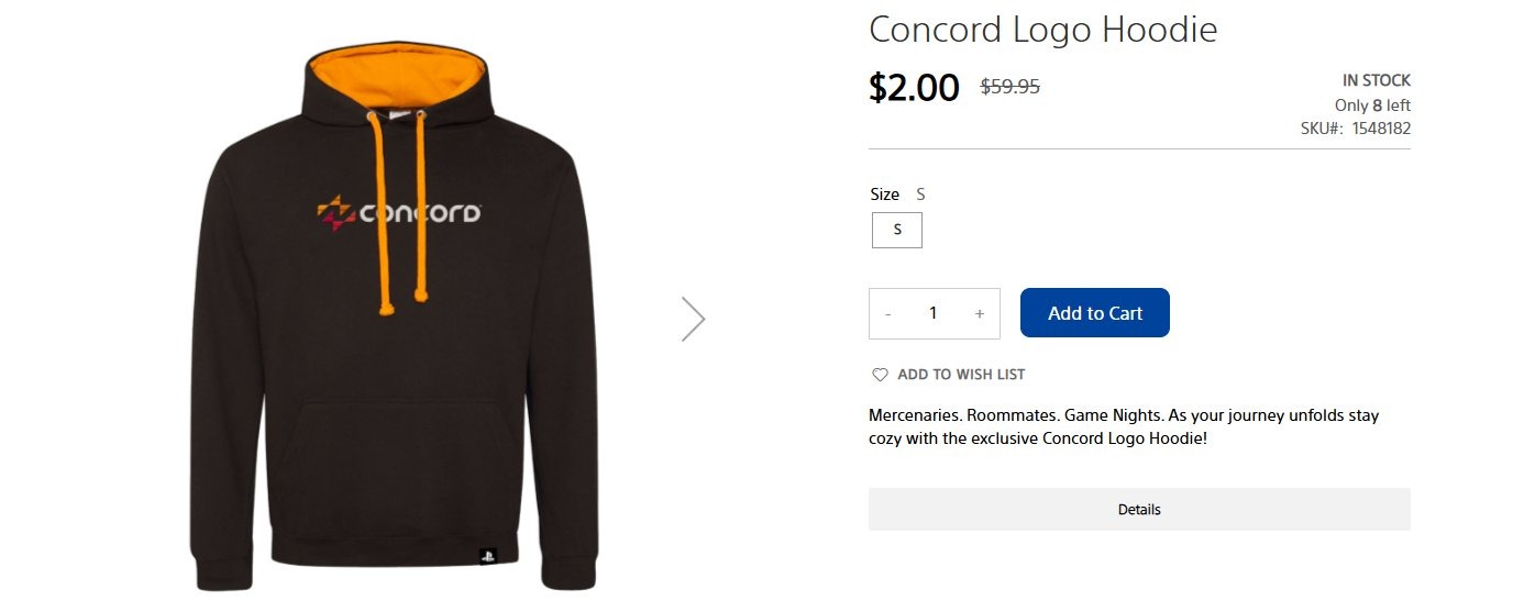 Спустя больше года после закрытия Concord, PlayStation внезапно вернула часть официального мерча в свой онлайн-магазин. На витрине снова появилась черно-оранжевый худи, который когда-то стоил $60, но теперь продавался всего за $2. Более того, при использовании промокода EXTRA25 цена снижалась до $1,50.