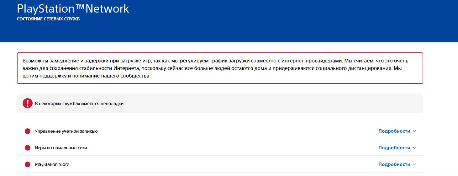 На официальной странице статуса говорится, что не работают все элементы сервиса. «В некоторых службах имеются неполадки», — гласит текст сообщения. Сюда входят PlayStation Store, игры, управление учетными записями и т. д. Притом сбой наблюдается не только в российском регионе, а во всем мире.