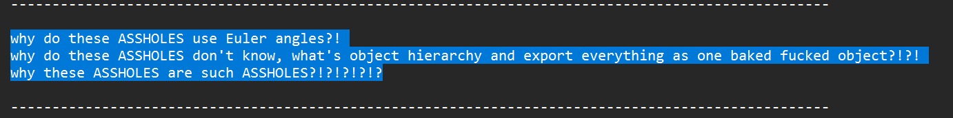 Как рассказал Dusk Golem в Twitter, утекший код принадлежит сборке 2011 года, за год до релиза игры. В коде также можно найти упоминания идей, которые разрабатывались еще с 2009-го. Но самой забавной находкой стал набор сообщений от одного из разработчиков, который явно не был в духе. В одном сообщении неизвестный «герой» саркастично комментирует способности монстра Скримера, а в другом переходит к полноценной эмоциональной разрядке в стиле «причина тряски», жалуясь на использование углов Эйлера и неправильную иерархию объектов: «Почему эти УРОДЫ используют углы Эйлера?! Почему эти УРОДЫ не знают, что такое иерархия объектов и экспортируют все как один целый, гребаный объект?! Почему эти УРОДЫ такие УРОДЫ?!?!?!»