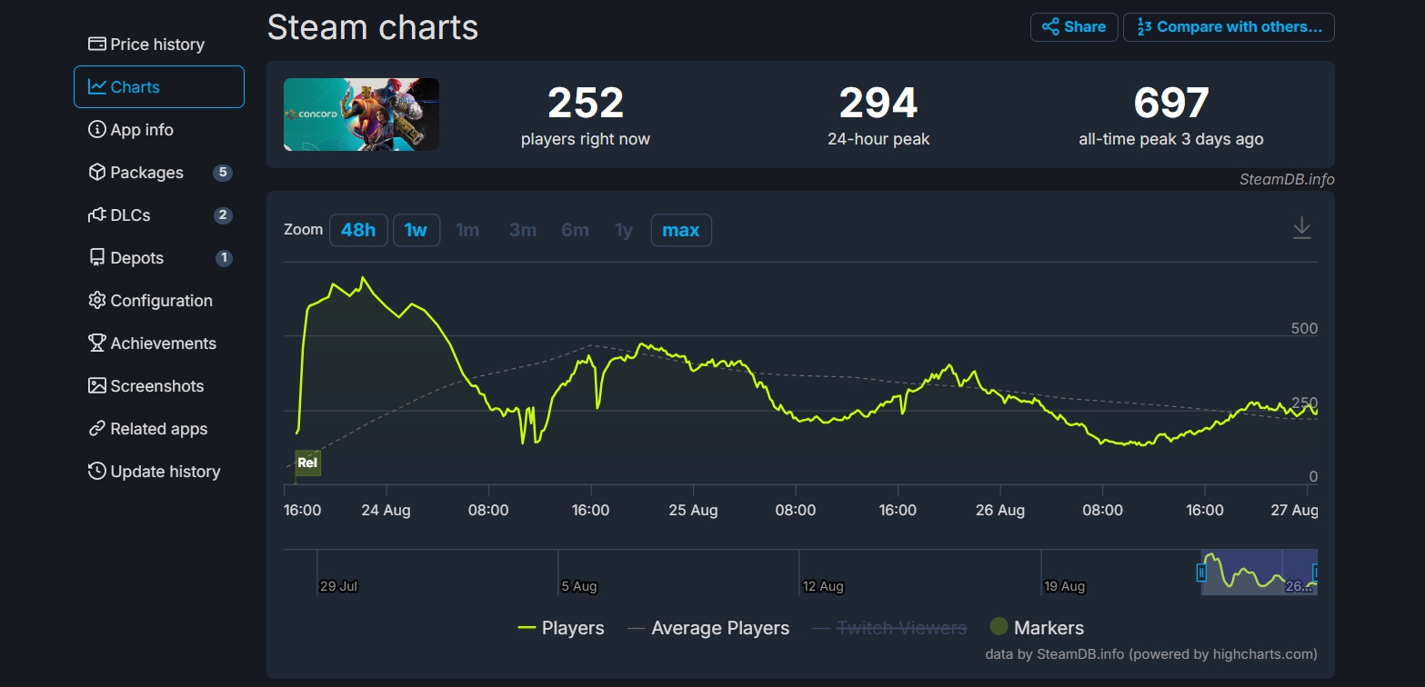 Поклонники Concord все усерднее просят сделать командный шутер за 40 долларов бесплатным: им не с кем играть в вышедшую новинку. Как уверяют геймеры, «из-за небольшого количества игроков найти матч уже почти невозможно, и даже если повезет, на поиск одного матча уходит от 5 до 8 минут». Притом всего за несколько дней пиковый онлайн Concord в Steam успел опуститься в два раза с момента релиза — до еще более скромных 294 человек. К несчастью фанатов, расти этот график пока что не собирается: