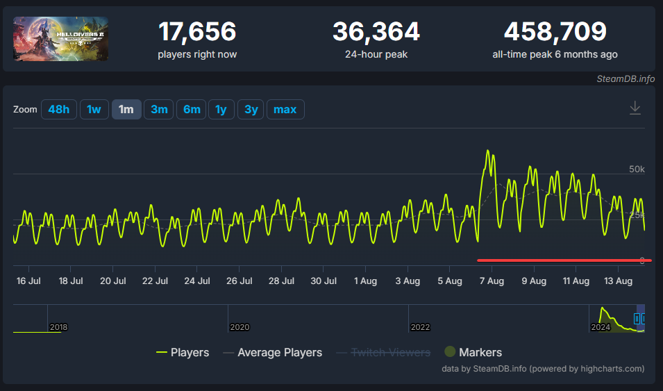Как и любой современный разработчик Эриксон очень извиняется. Он подчеркнул, что команда Arrowhead осознает свои ошибки и понимает, что на данном этапе важны не слова, а действия. Тем временем важно отметить, что аудитория Helldivers 2 быстро откатилась к показателям до патча, который должен был сделать игру снова великой. Не получилось, не фартануло.