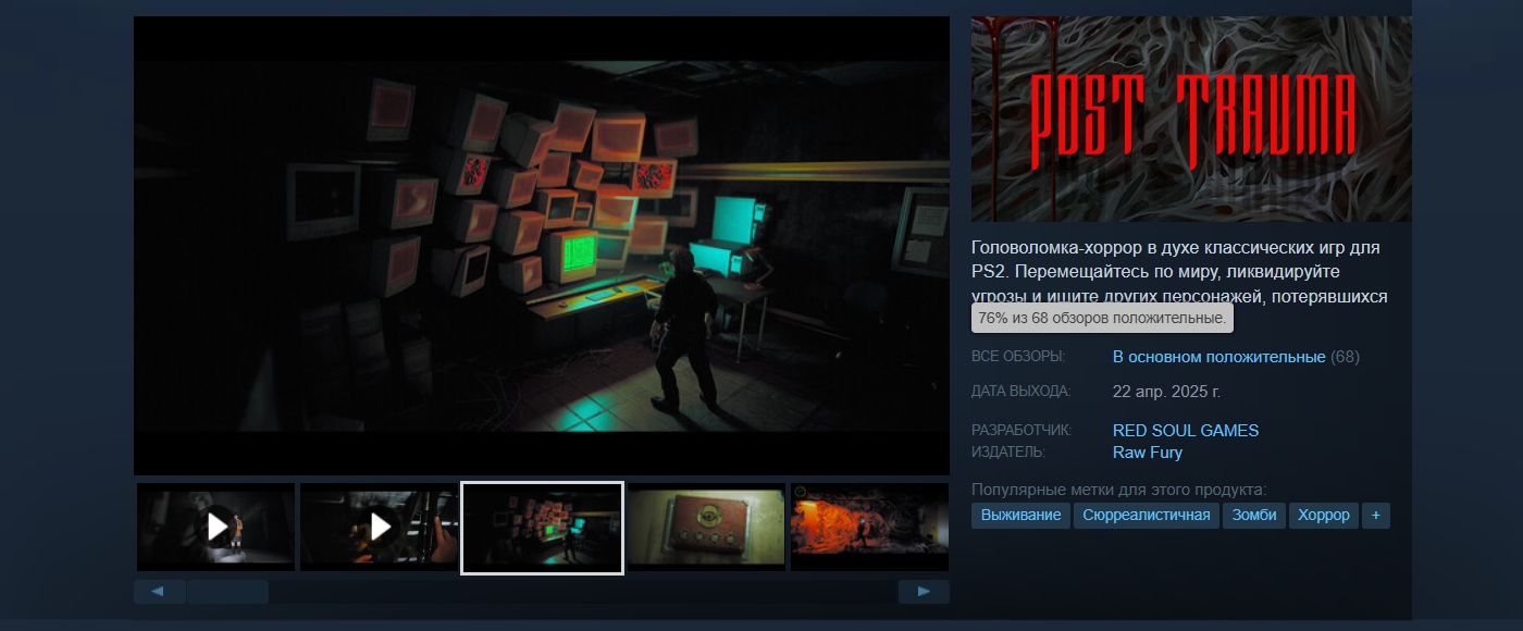Релиз олдскульного сурвайвл-хоррора Post Trauma прошел с некоторым скрипом. Инди-игра ожидалась еще в октябре 2024 года, но затем ее выпуск перенесли до марта. За несколько дней до выхода ее ожидал новый перенос, в этот раз окончательный — на 22 апреля. Судя по первым отзывам в Steam, разработчики явно вложили немало сил в свое детище, но не смогли в достаточной мере отполировать его. Post Trauma получила преимущественно «в основном положительные» обзоры. Геймеры хвалят атмосферу и визуальный стиль проекта, ругая головоломки и боевую систему. Периодически игроки сходятся во мнении, что им не хватает возможности поставить игре нейтральную оценку: