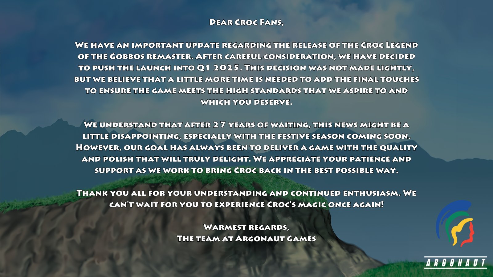 Argonaut Games — студия, которая восстановила свою деятельность спустя 20 лет после своего закрытия в 2004 году. Об их возвращении стало известно в августе: тогда Argonaut Games объявила, что первым проектом после стольких лет станет ремастер игры 1997 года. Новый Croc: Legend of the Gobbos должен был увидеть свет в конце 2024.