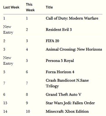 Портал GamesIndustry опубликовал десятку самых продаваемых игр на территории Великобритании. Resident Evil 3 дебютировала на втором месте, но радости от этого немного, ведь количество проданных копий вдвое меньше, чем у ремейка второй части.