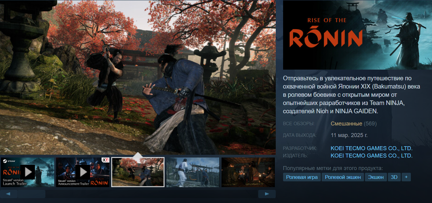 Стартовые отзывы на Rise of the Ronin не радуют. У игры лишь 43% положительных отзывов из 524 на момент написания заметки. Любопытно, но в основном ругают именно техническую составляющую, когда как геймплей многим понравился.