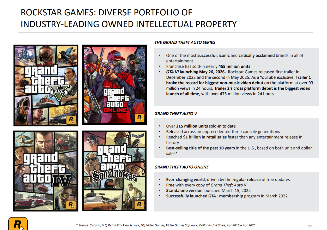 Один из слайдов презентации показывает, что франшиза Grand Theft Auto разошлась тиражом «почти 455 миллионов копий», из которых на GTA 5 приходится 215 миллионов копий. Кроме того, пятая часть также достигла 1 миллиарда долларов в розничных продажах быстрее, чем любой другой развлекательный продукт в истории, и стала «самой продаваемой игрой за последние 10 лет в США как по количеству копий, так и по выручке».