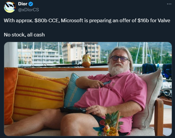 Как гром среди ясного неба прозвучала новость, что Microsoft собирается купить Valve за смешные 16 миллиардов долларов. СМИ с радостностью разнесли эту новость, приговаривая, что ее сообщил уважаемый стример, блогер и, конечно, инсайдер, каких еще поискать, с ником Dior. Все его сообщение выглядело вот так.