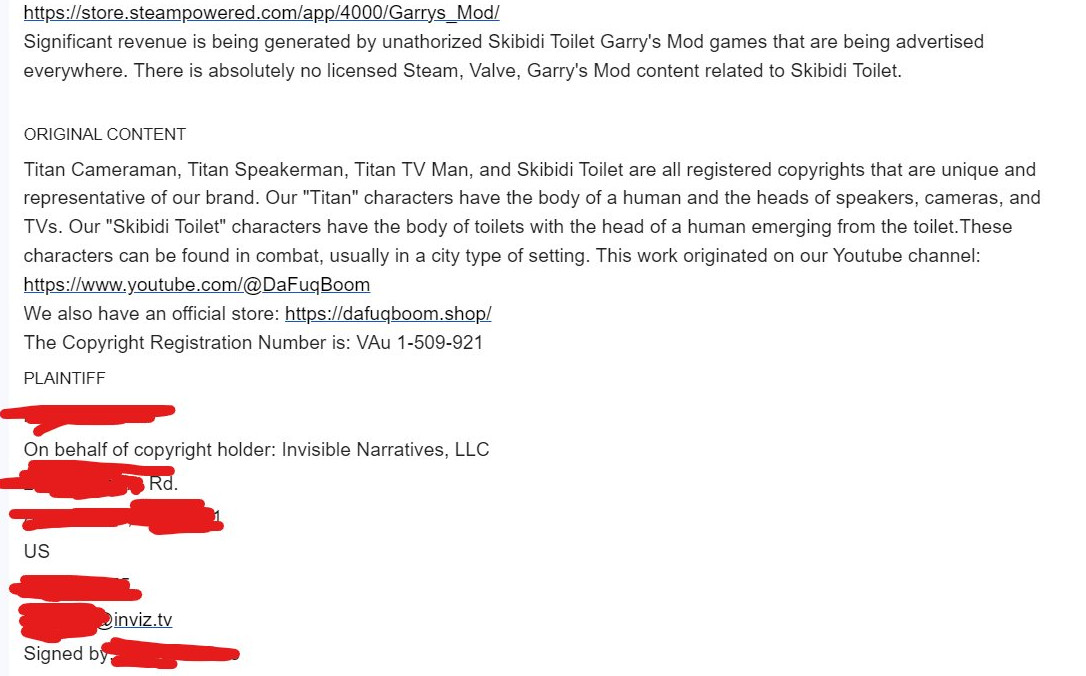 «Уникальные и репрезентативные» персонажи в лице «Камерамена» и голов внутри туалетов «появились на YouTube-канале» DaFuqBoom — именно так заявляется в иске. Загвоздка в том, что персонажи были созданы на базе Garry's Mod и с помощью ассетов из Half-Life 2.