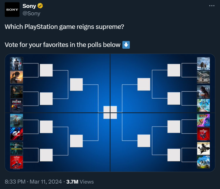 Аккаунт Sony в соцсети X запустил битву за звание лучшего эксклюзива на выбывание. Она проходит в несколько раундов с помощью голосования. Даже на такой небольшой по размерам картинке можно заметить, что Bloodborne в списке номинантов отсутствует.