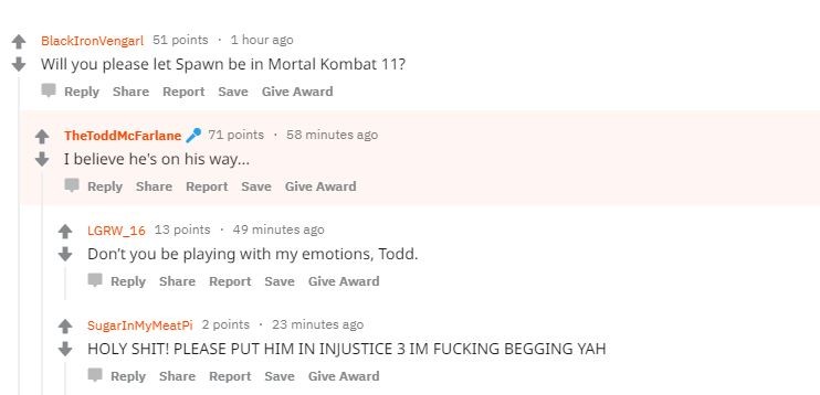 Создатель комиксов о Спауне Тодд Макфарлейн принял участие в недавней сессии вопросов и ответов AMA (Ask Me Anything) на игровом форуме Reddit. Кроме вопросов о комиксах и скорой экранизации, геймеры спросили автора о появлении героя в Mortal Kombat 11. К удивлению фанатов Макфарлейн ответил положительным «Я верю, что он уже в пути...».