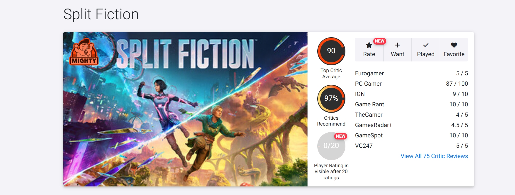 IGN: 9/10. «Это экспертно сделанная захватывающая ко-оп адвенчура, которая скачет из одной жанровой крайности в другую, Split Fiction представляет собой американские горки с игровыми идеями и стилями, которые обычно отбрасываются так же быстро, как и возникают».